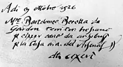 Nach der Schlacht von Pavia im Februar 1525, bei der spanische Arkebusenschützen der französischen Reiterei empfindliche Verluste beibrachten, erhielt Beretta einen Großauftrag vom Arsenal in Venedig.[2] Im Jahr 1526 zahlte ihm das Arsenal 296 Dukaten für 185 Arkebuseläufe. Die dafür ausgestellte Quittung, ist das erste schriftliche Dokument, die ihn als Waffenlieferant der Serenissima aufweist.[3]
