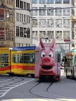 Das sogenannte Säuli-Tram mit der Nummer 1322 warb ursprünglich für die Basellandschaftliche Kantonalbank und wurde Ende 2012 ausgemustert. Heute befindet es sich im Schweinemuseum in Stuttgart.