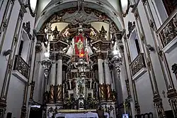 Innenraum; über dem Hochaltar vor einer roten Draperie der Crucifixus Senhor do Bonfim