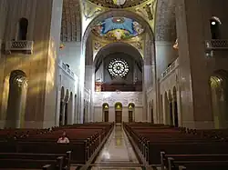 Leitthema des aufwendigen Mosaiken- und Skulpturenschmucks ist Maria als Mutter aller Einwanderer und ihrer Herkunftsländer. In 70 Kapellen und Nischen sind unter anderem Nachbildungen von Gnadenbildern aus aller Welt ausgestellt, darunter das von Altötting[3] und das von Mariazell.[4] Neben byzantinisierenden Ausstattungsteilen enthält die Basilika die weltgrößte Sammlung zeitgenössischer Sakralkunst.[5]