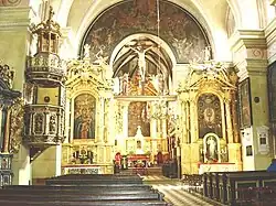 Der spätmanieristische Hauptaltar aus den 1730er Jahren zeigt das Gemälde Anbetung der Heiligen Dreifaltigkeit und der Jungfrau Maria des venezianischen Malers Tommaso Dolabella. Weiterhin befindet sich am Altar ein Gemälde der Jungfrau mit Kind, das nach einem Stich des römischen Kupferstechers Antonio Caranzani gemalt wurde. Ein weiteres Bild ist die Anbetung des Allerheiligsten Sakraments durch Vertreter des Klerus und der Laien, gemalt nach einem Stich des Antwerpener Kupferstechers Antoni Wieri.