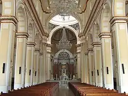 Die dreischiffige Basilika hat einen rechteckigen Grundriss, auf dem das erhöhte Mittelschiff mit dem Chor und dem Querschiff ein Kreuz bildet, dessen Schnittpunkt von einer Vierungskuppel auf einem durchfensterten Tambour beleuchtet wird. Das Mittelschiff und die beiden niedrigeren, als Gänge genutzten Seitenschiffe sind mit Kassettendecken versehen. Die Hauptfassade besteht aus zwei mit Kuppeln abgeschlossenen Türmen, hinter dem Mittelteil erstreckt sich das Hauptschiff.