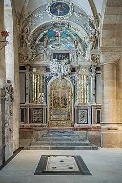 Die Gedenkstätte ist in zwei der vorderen Joche des linken Seitenschiffes eingerichtet. Es wurde zwischen 1587 und 1611/12 von oberitalienischen Meistern errichtet. Von 1592 bis 1597 hatte Alessandro de Verda die Bauleitung. Sebastian Carlone stellte das Mausoleum von 1597 bis 1611/12 fertig. Besondere Wirkung erzielen der weiße Marmor – er ist neben anderen Farben dominierend –, vergoldete Bronze, Schmiedeeisen, Stuck und Malerei.[12][13]