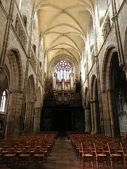 1339 begannen die Arbeiten am heutigen gotischen Bau, die sich mit mehreren Unterbrechungen – am längsten durch den bretonischen Erbfolgekrieg – bis zur Mitte des 15. Jahrhunderts hinzogen. Von 1450 bis 1468 entstand der bemerkenswerte spätgotische Kreuzgang. Der südliche Querhausturm mit seiner durchbrochenen Spitze wurde erst 1785 vollendet.