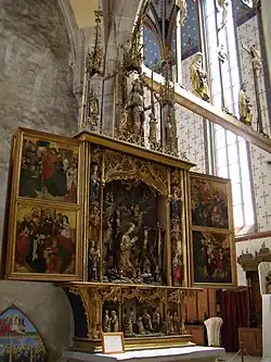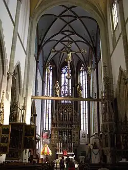 In der von der Form her einfachen und strengen Architektur gibt es viele wertvolle Details und Kunstwerke. Unter den elf spätgotischen Flügelaltären aus der Zeit von 1460 bis 1520 gilt als wertvollster der Seitenaltar Geburt des Herren, den man dem Umkreis der Krakauer Werkstatt von Veit Stoß zuschreibt.[6] Die Kalvariengruppe stammt von Paul von Leutschau.