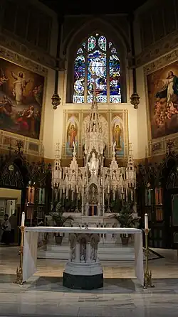 Das Gebäude mit 1000 Sitzplätzen wurde aus Bruchstein im neugotischen Stil errichtet. Die Kirche verfügt über eine geschnitzte und schablonierte Decke. Sie ist ausgestattet mit Marmoraltären, Buntglasfenstern und Eichenbänken. Rechts vom Altar befindet sich eine schöne Replik von Murillos Himmelfahrt der Jungfrau Maria. Die Decke, die meisten Wandgemälde und einige der Buntglasfenster stammen von Guido Nincheri aus den 1920er und 1930er Jahren. Wesentliche Fenster stammen von Franz Mayer aus München. Die Kreuzwegstationen sind Flachreliefs von 1876.