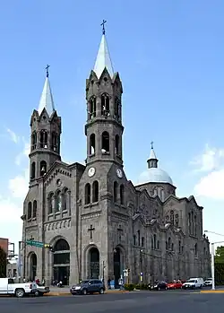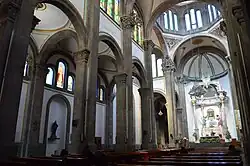 Die dreischiffige Basilika wurde historistisch ausgeführt, trotz Beschreibungen als neugotischer Kirche sind die Bögen rund ausgeführt. Die Kirche besitzt ein 10,5 Meter breites Mittelschiff mit einem in fünf Joche gegliederten, 19 Meter hohen Tonnengewölbe, die Kuppelgewölbe der nur halb so breiten Seitenschiffe sind nur 10,5 Meter hoch. Die Vierungskuppel ragt über dem Tambour 35,5 Meter bis in die Laterne hoch, die Türme der Doppelturmfassade erreichen 50 Meter. Die Pilaster und die inneren Bögen sind steinverkleidet, von der verputzten Decke des Tonnengewölbes öffnen sich Stichkappen zu den Buntglasfenstern. Der mit einer runden Apsis abgeschlossene Altarraum ist mit einem Altar aus Carrara-Marmor ausgestattet. Über ihm erhebt sich ein 12,5 Meter hohes Ziborium mit Säulen aus Tepeaca-Marmor.[2]