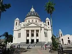 Die Kirche hat in der Region eine herausragende Größe. Die Fassade besitzt einen klassizistischen Portikus, der auf vier Säulen einen dreieckigen Giebel trägt. Sie ist 80 Meter lang und 73 Meter breit und bietet Platz für 9000 Gläubige. Ihre Zentralkuppel auf einem durchfensterten Tambour hat einen Durchmesser von 28 Metern, sie wird von einer 7,5 Meter hohen, kupfernen Marienstatue gekrönt[3], womit sie mit einer Gesamthöhe von 83 Metern die höchste in Südamerika ist. Vier niedrige Glockentürme rahmen die Kuppel seitlich ein.