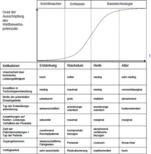 Basistechnologien entsprechen dem aktuellen Standard. Im Hinblick auf das Wettbewerbspotenzial[Anm. 1] beziehungsweise das Marktpotenzial lassen sich drei Technologietypen unterscheiden, und zwar Schrittmachertechnologien, Basistechnologien und Schlüsseltechnologien (siehe rechts).[2] Schrittmachertechnologien sind Problemlösungen und befinden sich noch im frühen Entwicklungsstadium der Produktentwicklung,[3] Basistechnologien befinden sich in der Reifephase des Grades der Ausschöpfung ihres Wettbewerbspotenzials, Schlüsseltechnologien unterliegen einer Phase des Marktwachstums. „Killer-Technologien“ sind Technologien, die im Zeitpunkt der Marktreife die vorhandenen Technologien und Schlüsseltechnologien als Substitutionsgut ersetzen.[4]