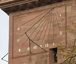 - die Sonnenuhr zeigt die Ortszeit, die gegenüber der Zonenzeit (MEZ) um rund eine halbe Stunde nachgeht (Basel liegt auf rund 7½ Grad östlicher Länge),