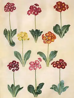 - Englische Aurikeln (im 18. Jahrhundert: „Painted Ladies“): Die Blüte hat ein weiß gepudertes Auge und unter Umständen auch Bemehlung in Form radialer Streifen oder einer Randzeichnung.