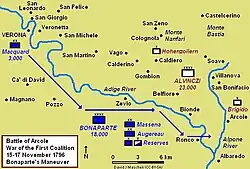 Die Schlacht bei Arcole fand vom 15. bis 17. November 1796 während des Italienfeldzuges zwischen den Franzosen unter General Napoleon Bonaparte und den Österreichern unter Feldzeugmeister Joseph Alvinczy bei Arcole in Italien statt. Österreichische Entsatztruppen für die von den Franzosen eingeschlossene Festung Mantua marschierten in zwei Kolonnen nach Verona. Nach dreitägigem Kampf mussten die Österreicher, die sich zwei Tage siegreich behauptet hatten, infolge Umgehung ihrer südlichen Flanke ihre Positionen räumen und zurückgehen.