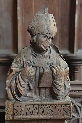 ![]() Holzskulptur eines Heiligen mit abgeschlagener Nase am Chorgestühl der Klosterkirche Auhausen | |||||||||||||