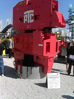 | Ramme | Mit Hilfe der Ramme lassen sich Spundwände und Stahlträger in den Boden einbringen oder aus diesem herausziehen. Der Antrieb der Ramme kann verschiedenartig ausgebildet sein. Man unterscheidet zwischen Dampframme, Dieselramme, Pressluftramme, Explosionsramme und Vibrationsramme. Die Ramme besteht aus dem Träger- oder Grundgerät und der eigentlichen Ramme. |