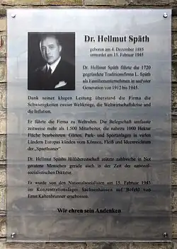 Bereits 1933 trat Hellmut Späth der NSDAP bei. Sein Betrieb profitierte von diesen Kontakten und erhielt Aufträge zur Begrünung von Autobahnen, beim Bau des Olympiastadions in Berlin und des Flughafens in Tempelhof. Späths erste Frau und damit auch die Tochter aus dieser Ehe waren Jüdinnen, auch beschäftigte Späth Juden in seiner Baumschule.[9] Im Jahr 1943 wurde Hellmut Späth verhaftet und wegen „Umgangs mit Juden und versteckter Hetz- und Wühlarbeit gegen Deutschland“ zu einem Jahr Haft verurteilt. Er wurde in das Konzentrationslager Sachsenhausen deportiert und am 15. Februar 1945 ermordet.[10]