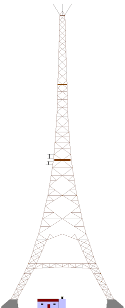 Um weit ins flache Land hinein ausstrahlen zu können, wurde 1932 ein 165 Meter hoher Sendeturm in Ismaning bei München erbaut. Für die Konstruktion verbaute man 300 Kubikmeter südamerikanisches Pechkiefernholz.[12] 1983 wurde der Turm gesprengt.