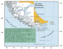 Wie man in der Karte sehen kann, weicht die Grenze vom Beagle-Kanal Richtung Picton-Durchgang ab, danach zum Richmond-Durchgang, um zwischen den Inseln Lennox und Nueva zu enden. Auf diese Weise erscheinen die Inseln Picton und Nueva unter argentinischer, die Insel Lennox unter chilenischer Hoheit. Die südlicheren Inseln bis zum Kap Hoorn werden weiterhin als unter chilenischer Hoheit gezeigt.