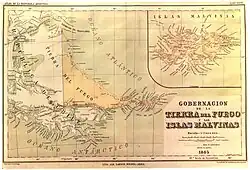 Die hier wiedergegebene Karte XXVII wurde Gobernación de Tierra del Fuego y las Islas Malvinas benannt, 1885 erstellt und ein Jahr später veröffentlicht.