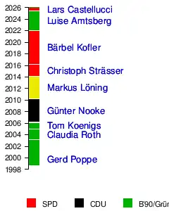 2003 folgte ihm Claudia Roth (Grüne), von Januar 2005 bis Februar 2006 hatte Tom Koenigs (Grüne) das Amt inne. Dann (seit Herbst 2005 gab es eine schwarz-rote Koalition unter Bundeskanzlerin Angela Merkel) wurde der Ex-Bürgerrechtler Günter Nooke (CDU) Menschenrechtsbeauftragter; zu dieser Zeit war Frank-Walter Steinmeier (SPD) Außenminister.