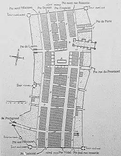 - Von den einst 16 Stadttoren steht nur noch die Porte de Lusies oder Luzier aus dem 14. Jahrhundert. Sie ist seit 1952 als Monument historique eingeschrieben. Das Tor hat einen leicht spitzen Bogen, und die darüber liegenden Mauern weisen einen Wehrgang auf, der seine Zinnen und Maschikulis verloren hat. Die Laufschienen des Fallgatters sind noch vorhanden. Der innere Wall endet mit einer Öffnung, die Teil desselben Tores ist, aber von Zinnen überragt wird. Der dazwischenliegende Raum muss ursprünglich aus Gräben bestanden haben. Das Tor muss von einem Torburg an der Seite der äußeren Gräben und von Hurden im dazwischenliegenden Raum dominiert worden sein.[14]