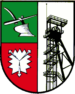Rechts in Silber ein schwarzer Förderturm. Links oben in grün ein silberner Pflug. Unten in rot das silberne Nesselblatt mit drei aufgelegten Nägeln. Die Flagge ist grün-rot belegt mit dem Gemeindewappen.[5] Es ist ein selbstredendes Wappen.