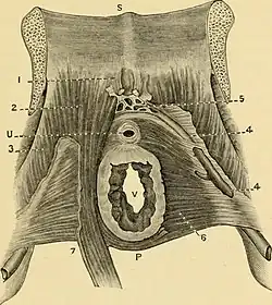 Das Diaphragma urogenitale spannt sich als dreieckige Muskelplatte transversal zwischen der Symphyse, den unteren Schambeinästen und den Sitzbeinhöckern aus und ist eine weitere Stabilisierung des Musculus levatortores nach caudal. Teilweise wird die Muskulatur in diesem Bereich durch Bindegewebe ersetzt.[1] Es setzt sich zusammen aus folgenden Muskeln: