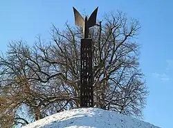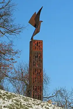 Die Skulptur des Bildhauers Wolfgang Skala (1904–1990) zeigt einen stark abstrahierten Adler, der sich aus einem engen, hohen Käfig befreit und seine Schwingen ausbreitet. Diese figürliche Darstellung steht symbolisch für den Abflug in eine freie Zukunft.[2] Das Werk wurde 1960 im Eisenguss ausgeführt[3] und trägt auf der Vorderseite das Datum 26.10.1955.