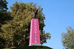 Der Wiener Künstler Eduard Freudmann (* 1979) schuf, darauf aufbauend, eine Intervention, die die Folklore um den Abzug der alliierten Truppen, den Stolz auf die Neutralität des Landes und den Opfermythos konterkarierte. Das Denkmal wurde temporär zum Obelisken, einer Form, die typischerweise Assoziationen mit einem Sieg hervorruft. Die rosa Farbe sollte dem Obelisken seine militärische Strenge nehmen. Die Inschrift ÖDUOPFER in weißen Buchstaben bediente sich der unter Jugendlichen verbreiteten Beleidigung und spielte auf den im Nachkriegsösterreich gepflegten Opfermythos an. Davon abgeleitet, hieß die Installation Monument to a myth oder kurz Monumyth. Im krassen Gegensatz dazu trieb auf einem nahegelegenen Teich ein Schriftzug, der als „fragiles Gegendenkmal“ für die Befreiung Österreichs vom Nationalsozialismus zu verstehen war.[7]
