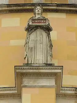 Die Schilde zwischen den Siegesgöttinnen bezeichnen Schlachten der Befreiungskriege. Sie lauten, rechts vom Eingangsportal aus im Uhrzeigersinn, wie folgt: Treffen bey Danigkow V April MDCCCXIII – Schlacht von Grossbeeren XXIII August MDCCCXIII – Schlacht an der Katzbach XXVI August MDCCCXIII – Schlacht von Kulm XXX August MDCCCXIII – Schlacht von Dennewitz VI September MDCCCXII – Treffen bey Wartenburg III October MDCCCXIII – Schlacht von Leipzig XVI XVII XVIII XIX October MDCCCXIII – Schlacht von Brienne I Februar MDCCCXIV – Treffen bey Bar sur Aube XXVII Februar MDCCCXIV – Treffen bey La Guillotiére III Maerz MDCCCXIV – Schlacht von Laon X Maerz MDCCCXIV – Treffen bey Limonest XX Maerz MDCCCXIV – Schlacht von Arcis sur Aube XX XXI Maerz MDCCCXIV – Treffen bey Lafère Champenoise XXV Maerz MDCCCXIV – Schlacht von Paris XXX Maerz MDCCCXIV – Schlacht von Waterloo oder Belle Alliance XVIII Iuny MDCCCXV – Treffen bey Strassburg XXVIII Iuny MDCCCXV.[7]