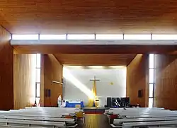 Das Kirchenschiff hat sieben Teile. Im ersten, flachgedeckten Teil, dem ein niedriger Anbau vorgelagert ist, befindet sich der Vorraum. Dahinter beginnt der Kirchsaal, der aus den übrigen Teilen besteht, die alle mit Pultdächern bedeckt sind, die innen eine Täfelung aufweisen. Jedes dieser Teile hat einen trapezförmigen Grundriss. Auf den Schenkeln des Trapezes stehen Wandscheiben, außen in Sichtbeton, innen mit Täfelung. Zwischen den unterschiedlich breiten Grundseiten der aneinandergrenzenden Trapeze befinden sich raumhohe Fensterbänder aus Gussglas. Die Stirnwand des Chores ist fensterlos, in der Ecke seiner Seitenwände werfen raumhohe Fensterbänder Tageslicht auf den Altar. Der Bodenbelag besteht aus Keramikfliesen. Über dem Vorraum befindet sich eine Empore, auf der ursprünglich eine Orgel von Johannes Rohlf stand. Diese befindet sich seit 2006 als Dauerleihgabe in St. Nikolaus Berlin-Wittenau.[1]