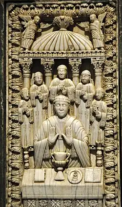 Vigilius († 555) gebrauchte die Formulierung „Text des kanonischen Gebets“ (canonicae precis textus). Die Überschrift des Messkanons lautet im Sacramentarium Gelasianum sowie im Missale Francorum: „Es beginnt der Kanon der Handlung“ (incipit canon actionis). Der Ordo Romanus interpretierte das Geschehen: Nach dem Gesang des Sanctus „erhebt sich allein der Papst und tritt in den Kanon ein“ (surgit pontifex solus et intrat in canonem).[48] Josef Andreas Jungmann zufolge bedeutete das ursprünglich, dass der Zelebrant sich aus der tiefen Verneigung während des Sanctus als einziger aufrichtete, um mit dem Messkanon fortzufahren. Die frühmittelalterlichen fränkischen Liturgieerklärer verstanden dies aber so, dass der Zelebrant nun in das „Heiligtum des Kanons“ eintrete, ähnlich wie der Jerusalemer Hohepriester am Versöhnungstag das Allerheiligste des Tempels betreten habe.[49] Das Verständnis des Canon missae als eines sakralen Raums hatte Konsequenzen für die abendländische Liturgiegeschichte. Der Priester war dort allein, wie Jesus Christus beim Gebet allein war (Eclogae de ordine Romano, 9. Jahrhundert), und in nächster Konsequenz sprach er den Text des Canon so leise, dass nur er selbst sich hörte.[50]