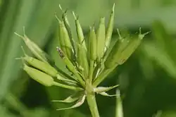 Die Blütezeit reicht von Mai bis Juli. Der doppeldoldige Blütenstand ist vor der Anthese überhängend und 10- bis 20-strahlig. Die Doldenstrahlen sind kahl.[4] Eine Hülle fehlt oder besteht aus ein bis zwei hinfälligen Hüllblättern. Die ungleich geformten fünf bis zehn Hüllchenblätter sind lanzettlich mit zugespitztem oberen Ende, breit weißhautrandig und bewimpert; sie sind zuletzt zurückgeschlagen.[4]