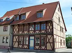 Das zweigeschossige Gebäude wurde in Fachwerkbauweise errichtet und war zum Teil verputzt. Das Fachwerk zeigt ein Bauerntanzmotiv. Im 19. und 20. Jahrhundert erfolgten größere bauliche Veränderungen. An der Schwelle befindet sich eine auf den Stadtbrand beziehende Inschrift: