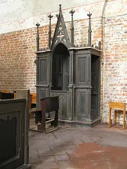 Nach den Zerstörungen im Dreißigjährigen Krieg (1618–1648) erhielten viel lutherische Kirchen eine neue Inneneinrichtung, zu der auch ein Beichtstuhl gehörte. Leonhard Christoph Sturm (1669–1719) setzte 1712 Beichtstühle als typisch für den evangelisch-lutherischen Kirchenbau voraus. Anders als in der römisch-katholischen Tradition wurden diese in der Nähe des Altarraumes positioniert.[9] Eine Besonderheit der lutherischen Beichtstuhltradition besteht darin, dass der Beichtstuhl mit der Kanzel so verbunden wurde, dass der Pfarrer von der Kanzel direkt in den Beichtstuhl gehen konnte. In dieser Form finden sich ein paar gut erhaltene Exemplare in der ehemaligen Herrschaft Breuberg (Odenwald).[10] Bemerkenswert bei diesen Beicht- und Pfarrstühlen ist, dass sie über Schiebegitter verfügen, die darauf hinweisen könnten, dass die Beichtenden vor dem Beichtstuhl standen oder knieten, während sie die Beichte ablegten.[11] Denkbar ist auch eine neue Frömmigkeits- und Standesentwicklung, die diese Form des Beichtstuhls begünstigten.[12]