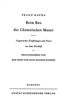 - ↑ Max Brod: Nachwort zu Max Brod und Hans-Joachim Schoeps (Hrsg.): Franz Kafka. Beim Bau der chinesischen Mauer. Gustav Kiepenheuer Verlag, Berlin, 1931, zitiert in: Klaus Hermsdorf (Hrsg.): Franz Kafka. Das erzählerische Werk I. Rütten & Loening, Berlin, 1983, S. 632