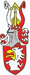 Blasonierung: „Das Wappen trägt den weißen Hals eines Geiers auf rotem Schild, auf dem Helm zwei Hörner weiß und rot, dazwischen ein gelbes Geschoss.“ |