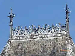 Die Zier des Dachfirstes ist die Firstbekrönung; solchen Zierrat – auch in Form eines Dachkamms – gibt es auch an Gerät und Mobiliar.[2] Im Bereich der Dächer können auch Stirnziegel als Bekrönung eingesetzt werden.