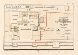 Es gab 11 Gesandtschaften und eine Anzahl ausländischer Firmen- und Bankenvertretungen. Dazwischen lebten einheimische Chinesen und betrieben ihre Gewerbe. Rund 12 christliche Missionsstationen in Peking lagen nicht im Gesandtschaftsviertel, sondern waren über die Stadt verteilt.[1]