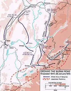 Die neue 1. Armee von Sun Li-Jen nahm am 21. Januar 1945 Kontakt mit Wei Lihuangs Armeen auf, die aus Yunnan von Hsipaw her, vorrückte. Die Ledo-Straße konnte endlich fertiggestellt werden. Anfang Februar 1945 konnte die Versorgung der anti-japanischen Kräfte in China auf dem Landweg über die 1736 km lange Verbindung von Ledo nach Kunming erfolgen. Der erste LKW-Konvoi aus Indien traf am 4. Februar in Kunming ein, aber zu diesem Zeitpunkt war der Wert der Ledo-Straße schon ungewiss, da sich die militärische Situation in China bereits gewandelt hatte. Zum Ärger der Briten und Amerikaner befahl der chinesische Führer Chiang Kai-shek General Sultan, seinen Vormarsch in Lashio zu stoppen, das am 7. März besetzt worden war. Die japanische 18. Division war bereits vollständig von der Nordfront zurückgezogen worden, um die britische 14. Armee im Zentrum von Birma aufzuhalten. Am 12. März wurde auch das Hauptquartier der 33. Armee dorthin entsandt, so dass die japanische 56. Division die Nordfront alleine sichern musste. Diese Division wurde dann Ende März und Anfang April 1945 auch nach Süden zurückgezogen.