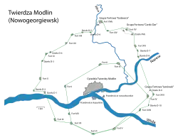 Nördlich von Warschau befand sich die russische Festung Nowogeorgiewsk (deutsch Festung Modlin). Diese war in den 30er Jahren des 19. Jahrhunderts errichtet und kontinuierlich verstärkt worden. Der Russisch-Japanische Krieg (1904/05) ließ jedoch daran zweifeln, ob es sinnvoll war, die Militärausgaben weiterhin in den Festungsbau zu investieren. Die Festung war bereits um 1900 veraltet, so dass der Kriegsminister eine Aufgabe erwog. Er wurde jedoch in der Regierung überstimmt, so dass Nowogeorgiewsk mit Finanzierungshilfen des französischen Bündnispartners modernisiert und erweitert wurde. Die Festung war über die Zeit zum Symbol der russischen Herrschaft in Polen geworden. So kam es, dass man sie auch aus politischen Gründen nicht aufgeben konnte, da ihr Verlust gleichbedeutend mit dem Verlust der Herrschaft über Polen war.[1]