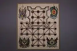 Das Belagerungsspiel wird auf einem kreuzförmigen Spielplan mit 35 Feldern gespielt, auf dem eine Burg mit neun Punkten sowie 24 Belagerungspunkten dargestellt sind (entspricht dem Spielbrett des Solitär). Zu Beginn des Spiels wählen die Spieler ihre Spielfarben. Der weiße Spieler platziert als Verteidiger seine beiden Spielsteine (Halmakegel) auf beliebigen Punkten der Burg, der schwarze Spieler stellt als Angreifer seine Figuren auf den 24 Punkten außerhalb der Burg auf.[1] Der weiße Spieler beginnt das Spiel.[2]