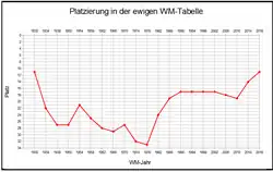 | 51 WM-Spiele 21 Siege 10[1] Unentschieden 20 Niederlagen 69:74 Tore | |