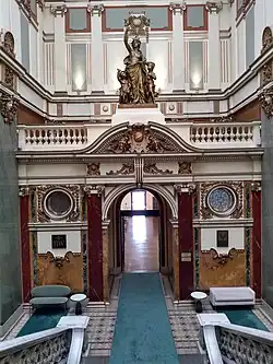 Es wurde mit gemischten Techniken gemauert. Die Keller, die sich unter dem gesamten Gebäude erstrecken, wurden aus Eisenbeton mit preußischen Kappendecken ausgearbeitet. Der Großteil des Gebäudes ist im klassischen Verfahren gemauert, mit Ziegeln und Kalkmörtel, und nur teilweise mit Eisenbeton. Die Überbrückung geschieht durch Unterbalken in den Seitenflügeln und durch Unterbalken und Bögen im mittleren Flügel. Die Konstruktion der Laterne über der zentralen Treppe ist in Form eines dreieckigen Metallgitters gelöst. Die Dächer sind mit Oberbau, kleinen Gefällen und mit Kuppeln versehen. Die äußeren Fassaden zu den Straßen hin sind im Sockelbereich mit Steinplatten verkleidet und in Kunststein verarbeitet. Die inneren zum Hof hin sind hingegen verputzt. Die Tragekonstruktion bei den meisten Jochen stellen neben Bögen auch Marmorsäulen dar. Die Treppen sind dreiläufig, aus Stein oder Marmor. Die Hilfstreppen hingegen sind Spindeltreppen aus Eisen. Die Innenwände sind verputzt und ausgemalt. In den repräsentativen Räumen sind sie zudem verziert mit Wandmalerei und Marmorimitat, Pilastern mit vergoldeten Kapitellen und applizierten polychromen dekorativen Frauenmasken. Die Böden sind aus Parkett oder Terrazzo. Dekorative Arbeiten sind an den Fassaden in Kunststein ausgearbeitet und im Inneren in Stuckplastik und Gips.