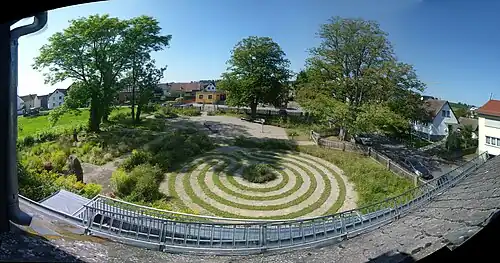 Der Sinnesgarten im Spätsommer 2021 bei Goldrutenblüte und das Bürgerhaus; rechts im Hintergrund der Frauenberg