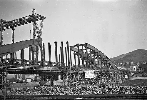Im Sommer 1934 begannen auf der Aussiger Seite die ersten vorbereitenden Arbeiten, darunter der Bau eines 70 Meter langen Damms durch die Firma Wähner & Co. Die Stahlkonstruktion der Brücke wurde von den Witkowitzer Eisenwerken gefertigt und im Winter 1934/35 geliefert. Ihre Qualität wurde durch rund 2.000 Festigkeitsprüfungen bestätigt. Die gesamte Konstruktion hatte ein Gewicht von etwa 1.760 Tonnen. Während die Eisenwerke Witkowitz die Hauptteile der Bögen und der Fahrbahn herstellten, lieferte der Ingenieur František Prášil aus Prag die Querträger, und das Unternehmen Georg Schicht AG aus Schreckenstein die Geschossträger und Geländer.