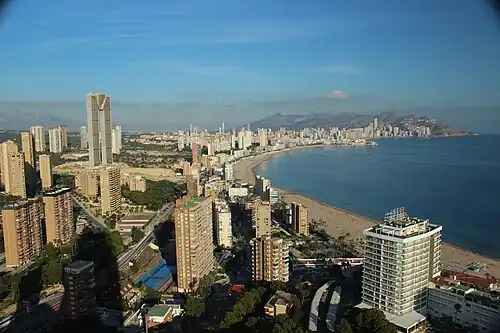 Benidorm hat die größte Hochhausdichte (pro Einwohnerzahl) weltweit mit 345 Gebäuden mit mehr als zwölf Etagen. Aufgrund der immensen Hochhausdichte wird Benidorm mit „little Manhattan“ assoziiert. So wurden etliche Wohntürme, welche zumeist der Tourismuswirtschaft dienen, ab den 1950er Jahren errichtet. Der 2007 geplante und 2021 fertiggestellte Wohnturm Intempo[8] (202,5 Meter, 47 Etagen), stand wegen der spanischen Immobilienkrise 2008 bis Ende 2021 leer.[9][10]