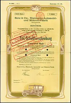 Historisches Wertpapier von Benz & Cie., Rheinische Automobil- und Motorenfabrik von 1912