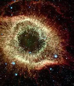Die Infrarotastronomie, mit Wellenlängen zwischen 700 nm und 300 μm, eignet sich zum einen zur Beobachtung vergleichsweise kalter Objekte wie Brauner Zwerge und solcher Sterne, die tief im Inneren von Molekülwolken eingebettet sind. Zudem ist der interstellare Staub bei solchen Wellenlängen weit durchsichtiger als für sichtbares Licht; so werden ansonsten hinter Staub verborgene Gebiete sichtbar, etwa die Kerne von Infrarotgalaxien, gerade erst in Entstehung befindliche Protosterne sowie das Zentrum unserer eigenen Galaxie, samt der direkten Umgebung des darin enthaltenen supermassereichen Schwarzen Lochs.[43]
