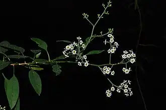 Der Blütenstand ist eine offene, seitenständige oder endständige Rispe. Die relativ kleinen, zwittrigen und fünfzähligen Blüten sind gestielt, sie sind radiärsymmetrisch mit doppelter Blütenhülle. Die Blütenstiele sind behaart und es sind kleine Tragblätter vorhanden. Es ist ein kleiner Blütenbecher ausgebildet. Die schmalen, bis 2,5 Millimeter langen Kelchblätter sind pfriemlich. Die Krone ist radförmig und weiß mit rosafarbenen Spitzen. Die zurückgebogenen und schmal-dreieckigen Kronlappen sind bis 4,5 Millimeter lang. Die kurzen Staubblätter stehen seitlich über die Krone hinaus. Die Staubbeutel stehen frei voneinander, sind dorsal (rückseitig) fixiert und etwa halb so lang wie die Staubfäden. Die Pollenkörner besitzen drei Poren und sind stachelig. Der unterständige und dreikammerige Fruchtknoten ist von einem scheibenförmigen, grünen Diskus besetzt. Der Griffel ist kurz mit dreilappiger und papillöser Narbe.