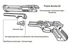 Die Pistolen der 92er-Serie sowie deren Nachfolger und Derivate funktionieren nach dem Prinzip des Schwenkriegelverschlusses, der zum ersten Mal in der Pistole Walther P38 Verwendung fand. Dabei verbindet ein unter dem Lauf angebrachter Riegel den Lauf mit dem Verschluss, indem die Verriegelungsansätze des Riegels in Aussparungen im Schlitten greifen. Zusätzlich befindet sich unter dem Lauf ein Stift, der den Entriegelungsvorgang einleitet. Nach dem Schuss bewegt sich der bewegliche Lauf zusammen mit dem Verschluss zurück. Nach einem kurzen gemeinsamen Weg trifft der Stift auf das Griffstück und wird zwischen den Lauf und den Riegel geschoben. Dadurch wird der Riegel nach unten gedrückt, und seine Verriegelungsansätze treten aus den Aussparungen im Verschluss. Jetzt stoppt der Lauf, und der Verschluss bewegt sich alleine zurück, wobei die Hülse ausgeworfen und der Hahn gespannt wird. Nach dem Abfeuern der letzten Patrone wird der Verschluss vom Schlittenfanghebel in hinterer Position gehalten, was einen schnellen Magazinwechsel ermöglicht.